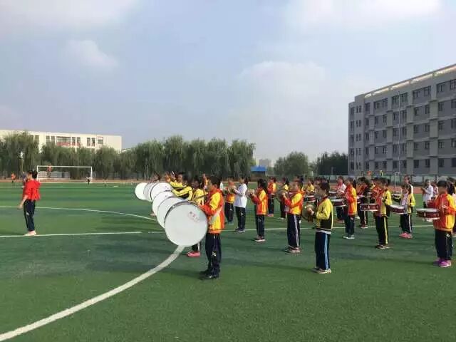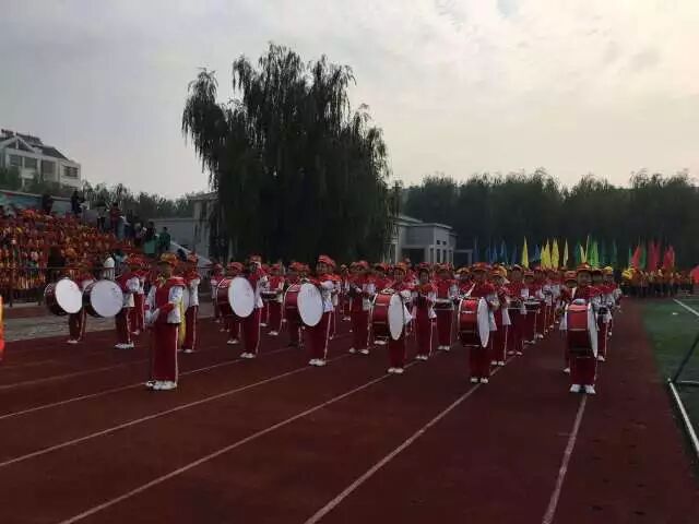 运动会上英姿飒爽的鼓号队员。他们将以嘹亮的乐声,整齐的鼓点,尽情展现现代小学生积极向上的风貌!沐浴着金秋的阳光我们的鼓乐队满怀激情地以一个大方阵展现!