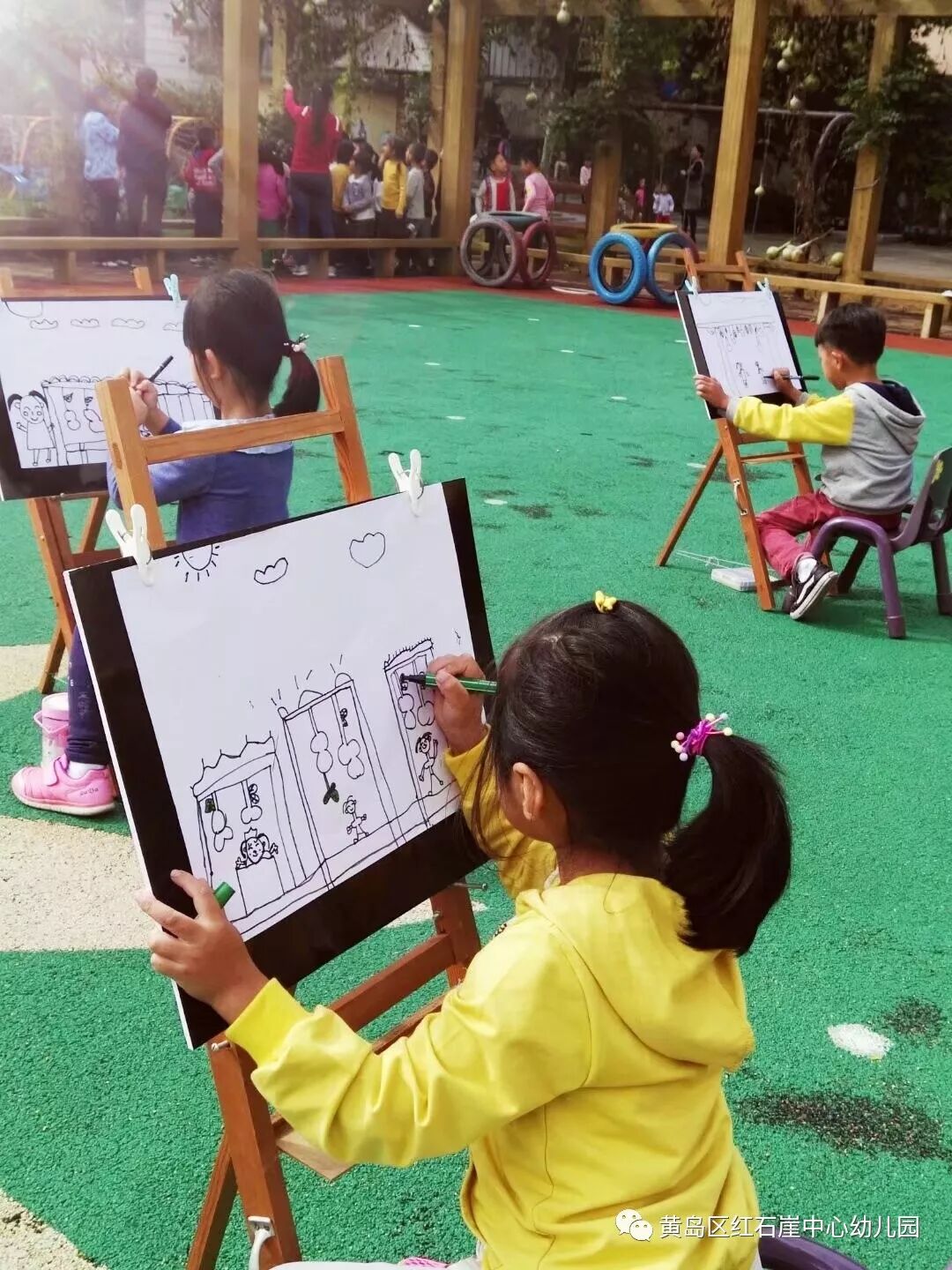 葫芦即将成熟,回廊下的景色愈发美丽起来。支起画板在蓝天白云下,一起来进行葫芦写生是件极美的事!瞧,孩子们画的多认真!之后将自己的作品来跟小伙伴们一起分享交流。