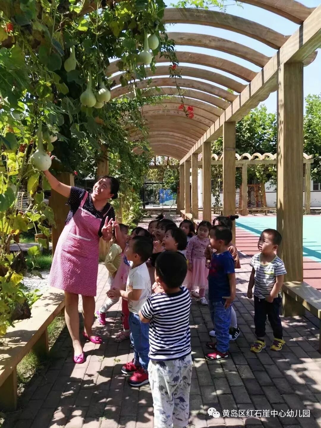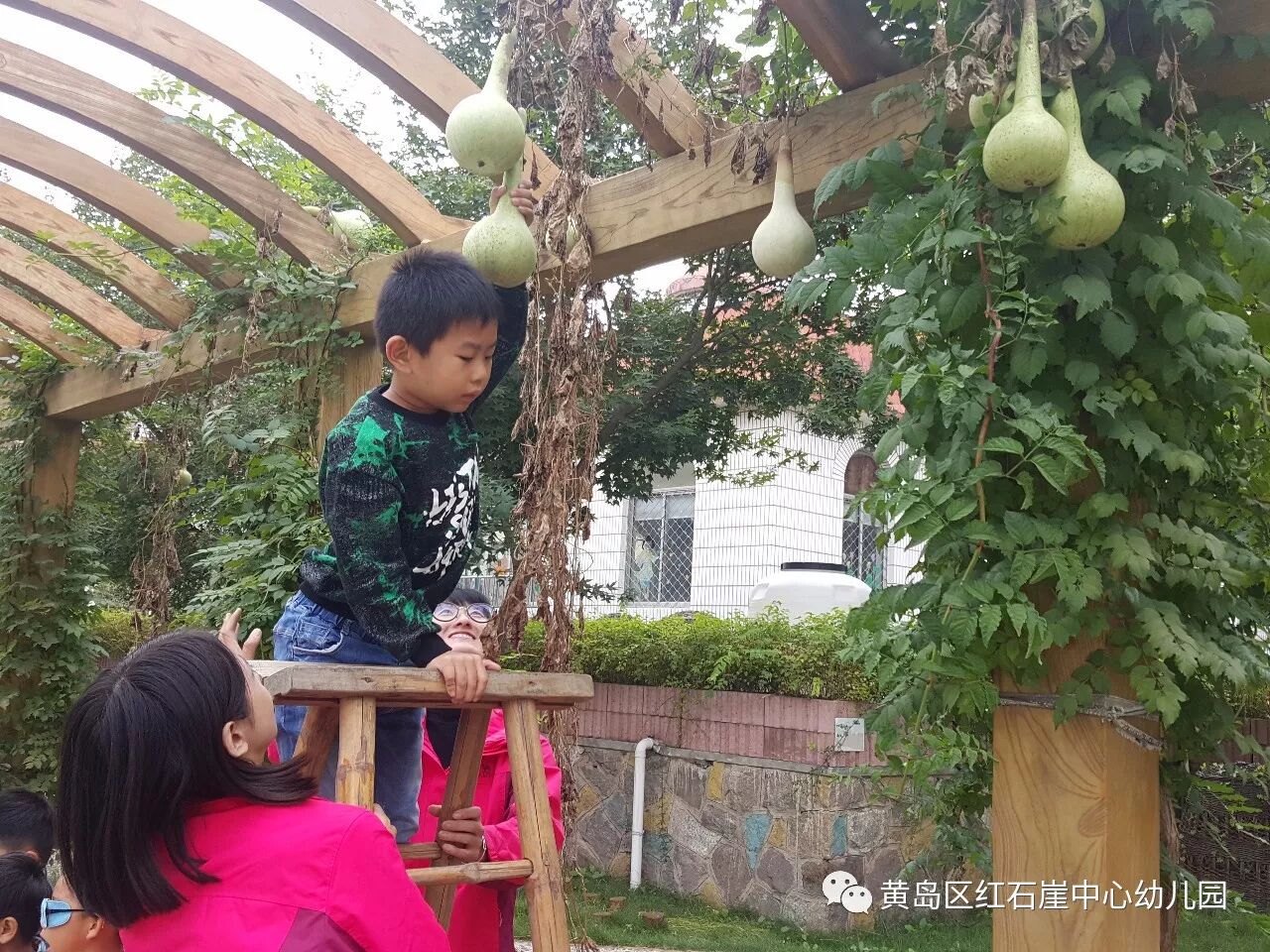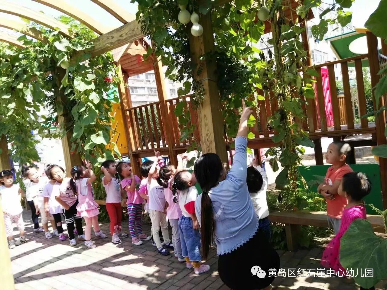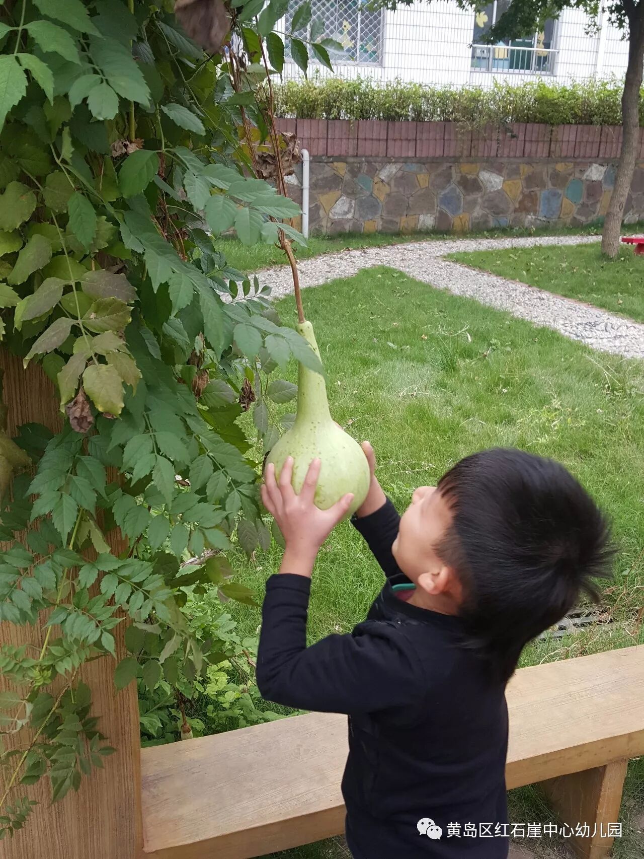葫芦坐果的季节,是孩子们最为兴奋的时候,大家每天都会在廊架下流连忘返,就这样,小葫芦在孩子们的关注下一天天的长大。