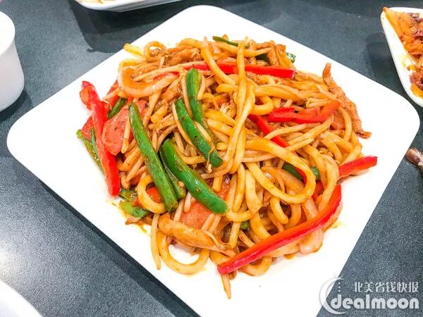 孜然炒拉条是我们一致给好评的,光看着颜色红红绿绿的就很吸引人,非常能勾起人们的食欲。拉条比兰州拉面的面要稍微粗一点,非常有口感,拉条拉的很有劲道。整体稍微有点偏辣,但是完全可以hold住!反正三两下我们就把它解决了!