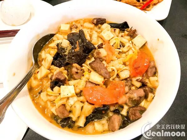 酸辣小炒泡馍是他们家的特色菜,味道是酸酸辣辣那种,泡馍掰成小块,吃起来的口感和那种粗面的口感差不多。觉得北方的人应该会喜欢,我是浙江的稍微会觉得有点重口味。