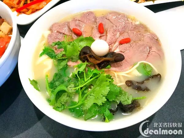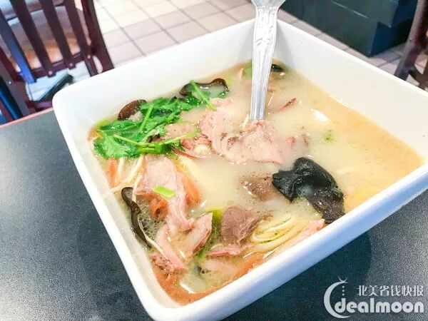 当当当,这是他们家的招牌:浓汤滋补羊肉烩面,用自己熬制的浓汤做汤底,配上宽宽很有嚼劲的手抻面,简直完美!虽然是羊肉,但吃不出羊膻味反而味道很鲜美,然后我们就把汤也给喝的干干净净,就是好喝,哈哈!