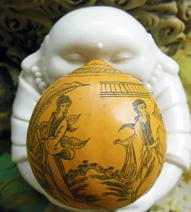 6、范制葫芦:范制葫芦者,当其幼小时纳入有阴文花纹之范,秋老取出,形状图文悉如人意,宛若斧削刀刻而成,诚天然与人工之巧妙结合。范制葫芦的最终形态令人称奇,它也是我国所独有艺术品。这种工艺由当初创作者大胆设想发明,并经长期探索、多方实践终于形成。
