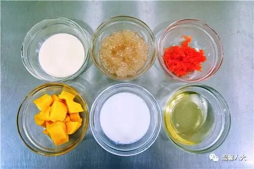 杨枝甘露的主要原料是淡奶油、西米、西柚肉、芒果、椰浆、糖水,非常健康可口。
