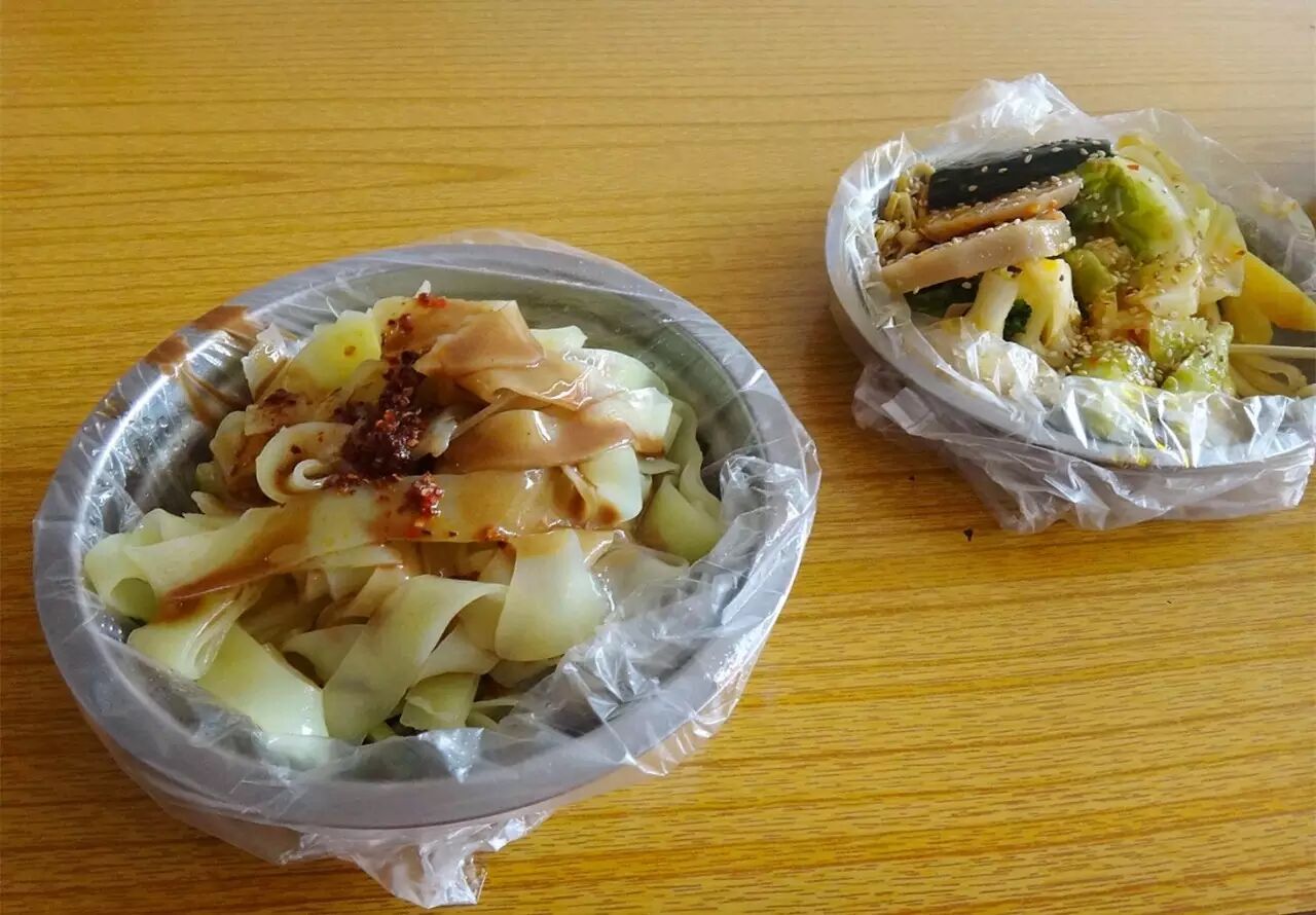 人不多的话,一分钟左右就可以装好了,味道咸香,面筋是很厚实很紧致的口感,辣椒依旧很辣。五块一小碗,六块一大碗,都可以吃得饱饱的啦。