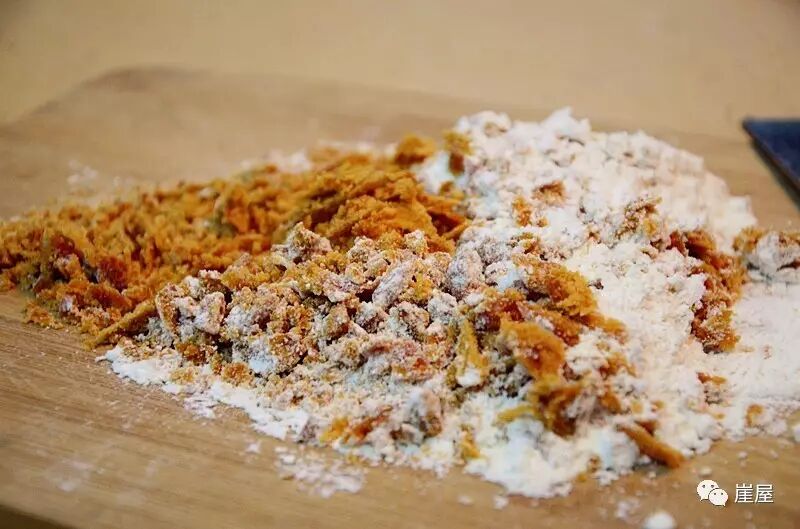 2、发酵时,把云南红糖切细,加入低筋面粉用勺子混合均匀,同时把红糖压成细沙状;