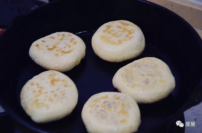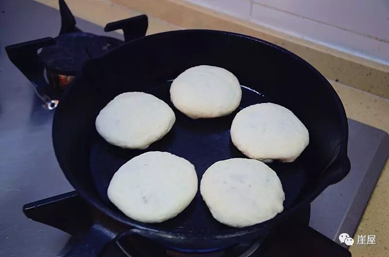 8、平底锅擦一层油,把面饼收口一面向下放入锅中小火烘烤,直到双面都成金黄色,也可以多点油直接煎到金黄更香。