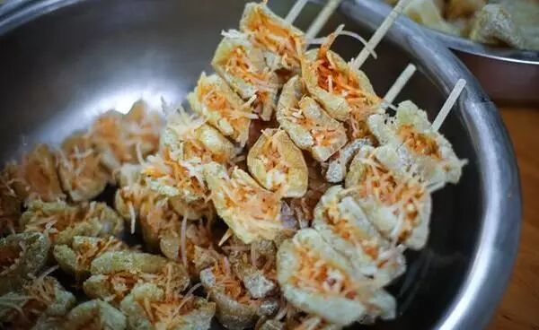 在成都及周边古镇盛行的一种名小吃,一般是四个为一串,用竹签串连在一起深为成都人,比如撩妹儿,及外地游客的喜爱。