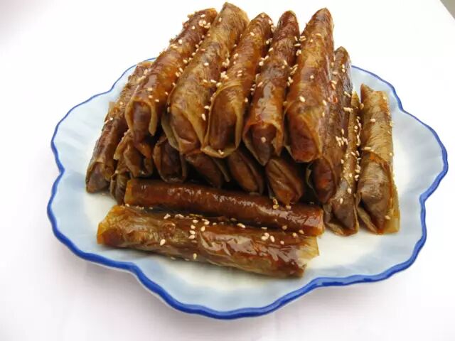 以黄豆为主料,磨成豆浆。制成油皮。裹以芝麻末,经蒸制而成。颜色棕黄,绵软干香,咸香鲜麻。