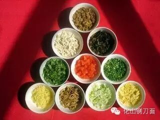 第四, 配菜马先要摊鸡蛋饼,之后,把葱白切丝,香菜切碎,姜、蒜切末,与蛋饼片搅拌,便得黄、绿、白三色相间的菜马,浇面时撒于膏汤之中,既美观,又出味。