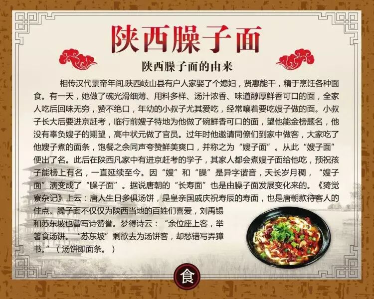臊子面以薄、筋、光、汪、酸、辣、香等特色,吃口柔韧滑爽。臊子面的特点是面条细长,厚薄均匀,臊子鲜香,面汤油光红润,味鲜香浑厚而不腻。臊子面对关中地区的人们生活的影响很大,无论大小喜事、逢年过节或家中来了亲朋好友都离不开臊子面。