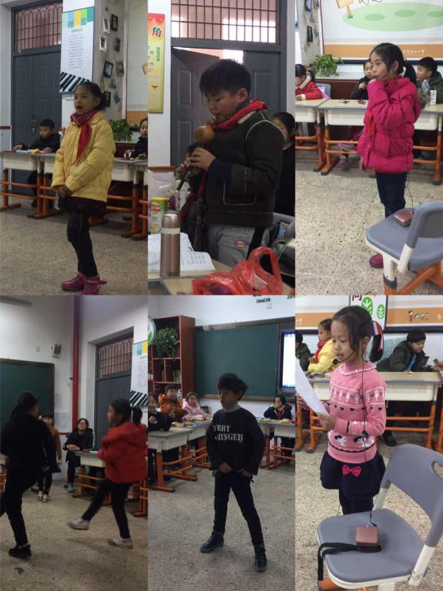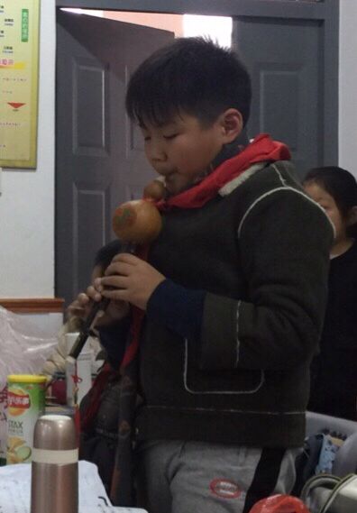 瞧,这位小男生站起来,握紧了手中的葫芦丝,深吸一口气,鼓足勇气,为我们吹出了美妙的曲调,一首是《月光下的凤尾竹》,另一首是《新疆舞曲》。