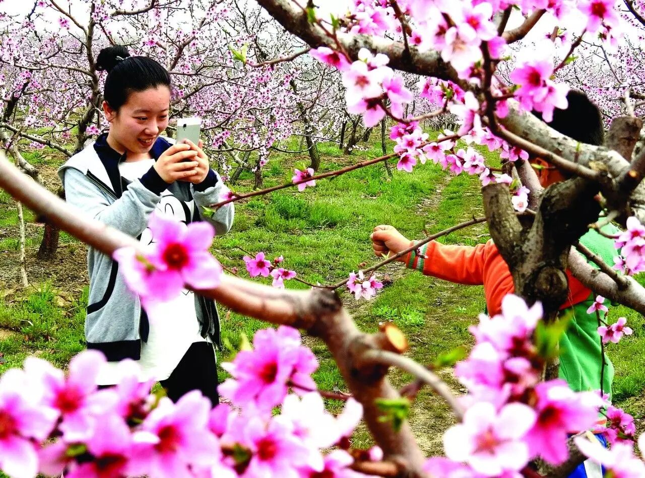在宽甸满族自治县古楼子乡的农家桃园里,游人看着鲜花,闻着花香,不停地拍照。