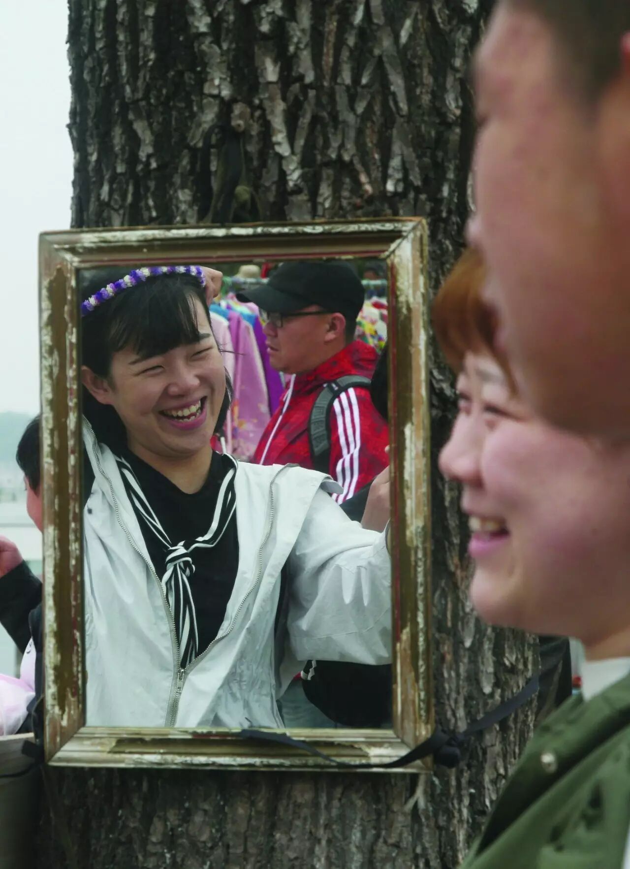 为了能在鸭绿江边留影,游客们都在镜子前仔细地梳妆打扮自己。