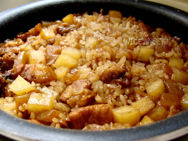 3、米洗净沥干水分,放入电锅中,加入切好的鸡肉、香菇、胡萝卜、笋、高丽菜等,并入酱油、盐、糖、酒、麻油、橄榄油、浸香菇的水及高汤拌匀,煮成饭后趁热拌松,即可食用。