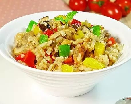 8、米饭熟后加入红椒,黄椒,青椒丁,再加入盐,鸡精调味,拌匀后出锅。
