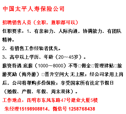 要求:学历不限,年龄22周岁以上,只要你有责任心,有激情,有良好的沟通能力和服务意识。有销售经验者优先!挑战高薪,无所畏惧。