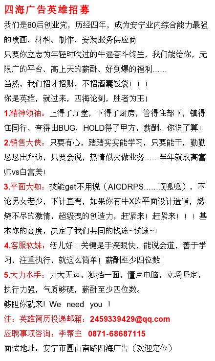 平面广告设计1名:要求:男女不限,有工作经验者优先,应届毕业生均可!