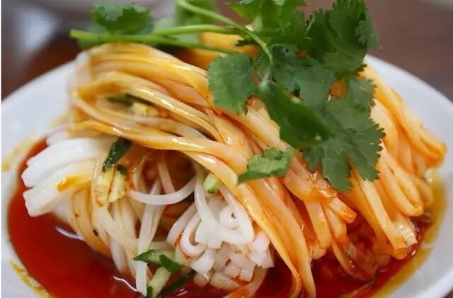 面皮里一般会配上面筋、黄瓜丝等配菜,吃起来更爽口一些。