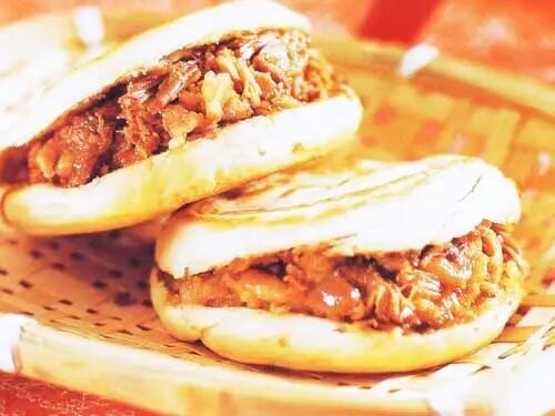 有凉皮的地方就有“腊汁肉夹馍”。极具秦地特色的肉夹馍,采用精制大块肉,煮至熟烂,剁碎后,再塞进开口的馍中。酱汁和肉以及带着麦香的白吉馍完美结合,相得益彰。