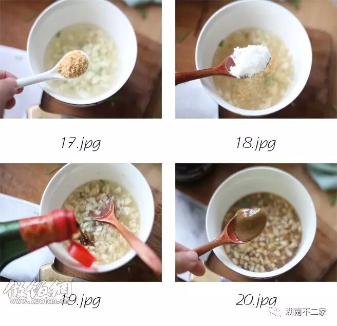 15:蒜切末,加花椒,放热水浸泡一会,让花椒的香味浸泡到水中。