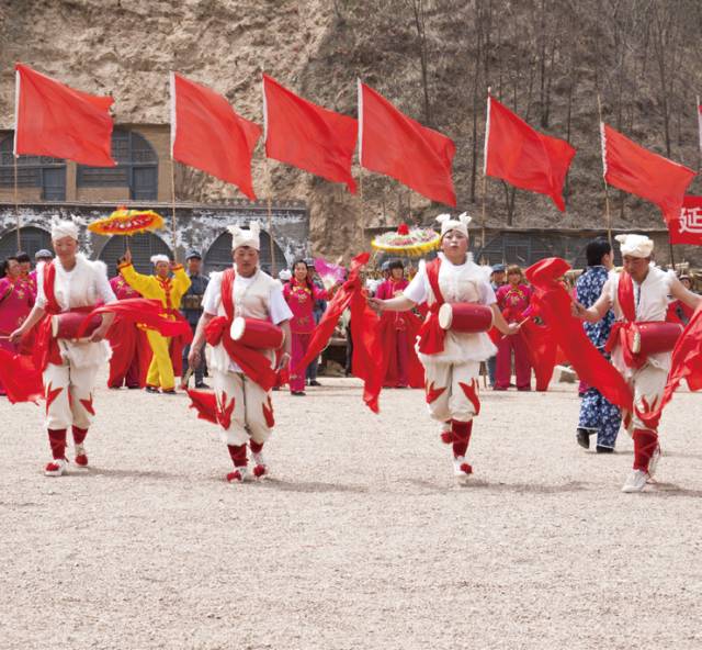 倘若你至今都没有看过安塞腰鼓表演,那么就找出1985 年版的电影《黄土地》来看一看吧。在那个封闭的安塞,他们用腰鼓将黄土地上流动着的生命原动力完美地展示出来:你看吧,在晴空下,上百名头扎白色羊肚毛巾、身穿黑色袄裤、腰系鲜红布带的陕北汉子在黄土高原上舞动起来。在惊天动地的牛皮大鼓声中,队伍整齐地转身、踢腿、前进、后退,他们踩在鼓点上,每一个动作都那么刚劲有力,而辗转腾挪又十分灵巧。与黄色的土地交相辉映,蔚为壮观。尤其在最后,陕北汉子们一起发出震耳欲聋的吼声,与鼓声融合在一起,一股穿云裂石的气势把安塞腰鼓推向了高潮。