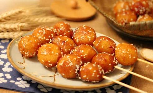 浑圆光亮,吃起来有股焦糖香味的糖油果子也是成都人民的最爱,外面沾满了喷香的白芝麻,咬下去皮脆内软,巴适的板!但是糖油果子的热量可是高得吓人喔!