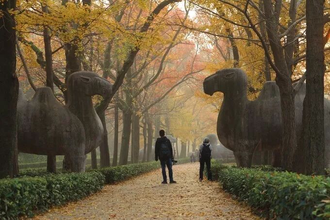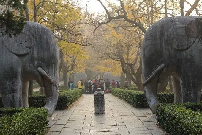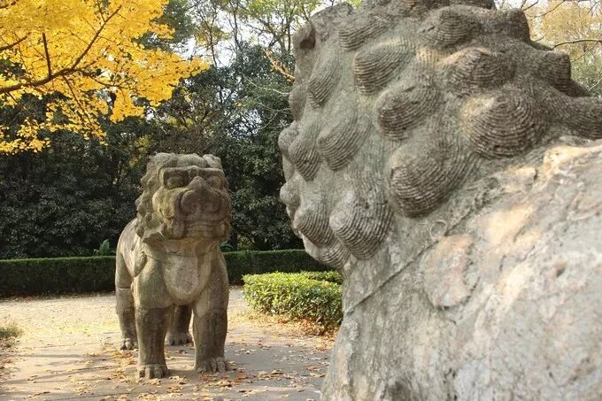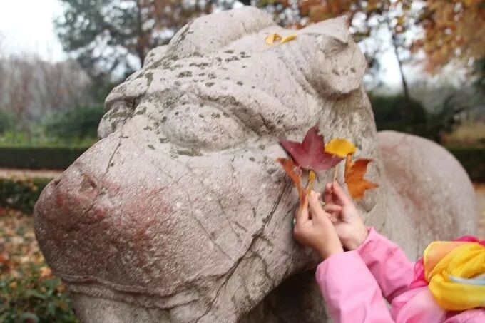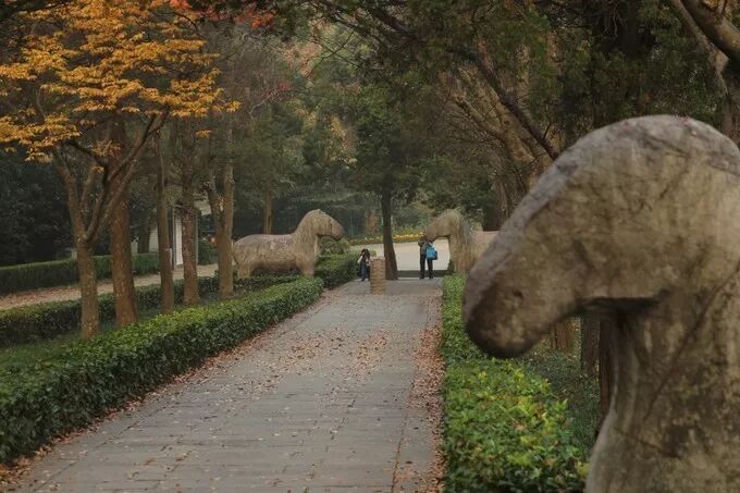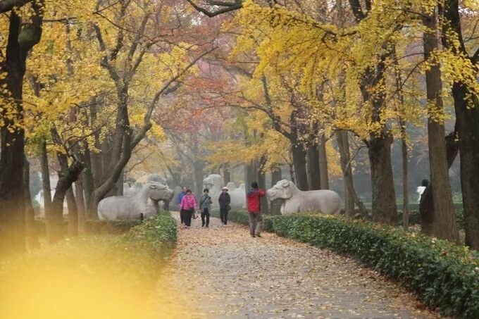 明孝陵的神道石刻是帝王陵中唯一不呈直线的,而是环绕梅花山形成一个弯曲的形状,形似北斗七星。以往也去过其他帝王陵寝,而明孝陵感觉截然不同,少了荒凉,多了惊艳,少了清冷,多了清幽,秋日的各色树叶与石像相得益彰,就在石像路上,本人足足呆了有近2个多小时。兴奋,寻到了秋的气息,兴奋,美不胜收。