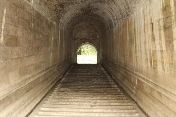 方城以大条石砌成,正中开拱门式斜隧道,有台阶可步入,计54级。