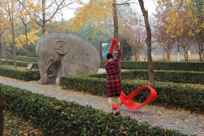 这六种石像,其中骆驼最为高大,造型也最为精巧,石像旁黄栌、枫树、银杏色彩各异, 自然也最受欢迎。有几位大姐(阿姨)更是带了道具,树下起舞,让人忍俊不禁。不过想想,人生难得我高兴,旁人眼光奈我何?