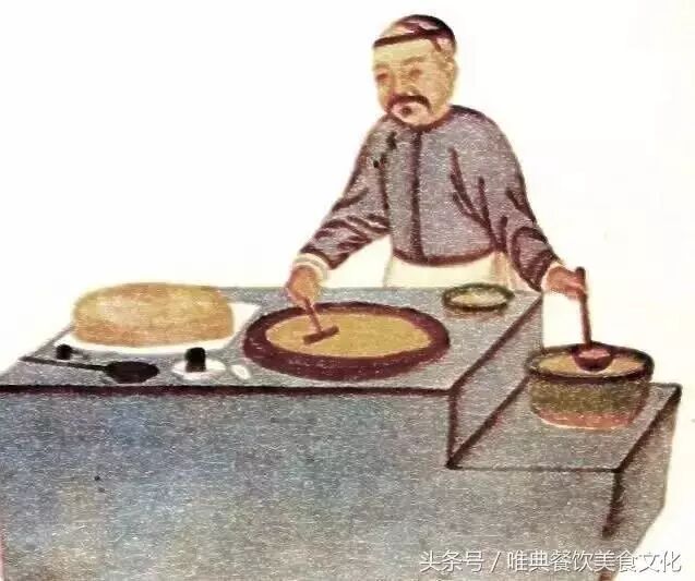 传统的煎饼,其实就是卷饼,薄薄的圆饼卷起不同的肉菜类,用手直接拿着吃。不过很多薄饼都可以这样吃,最有名的当然有春饼和烤鸭饼,不同的是,煎饼是用现浇面汁煎成,不是先擀好饼再烙成。而且煎饼有特别的饼铛,一般是无沿的平底铛,在古代又称为鏊。 由传统煎饼生发出来的还有各色馅饼,现在街头又流行起鸡蛋灌饼,这都是改良的煎饼。 古代煎饼早先使用的原料,应当是小米,小米杂粮煎饼是古代北方人的常食之一。 煎饼有悠久的历史,不少考古证据表明,饼食在中国史前已经出现多样化发展趋势,史前人的盘中餐不仅有面条,还有煎饼、烤饼之类。仰韶人已经创制有陶鏊之类的烹饪器具,煎饼已经有5000年的历史。 后来各时代的饼铛都有出土,也发现有不同时代烙煎饼的壁画多幅,揭示了煎饼在历史上的真实存在。