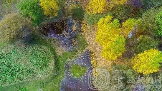 满地金黄的落叶、穿插着还未完全衰败的绿草