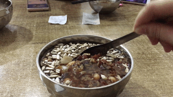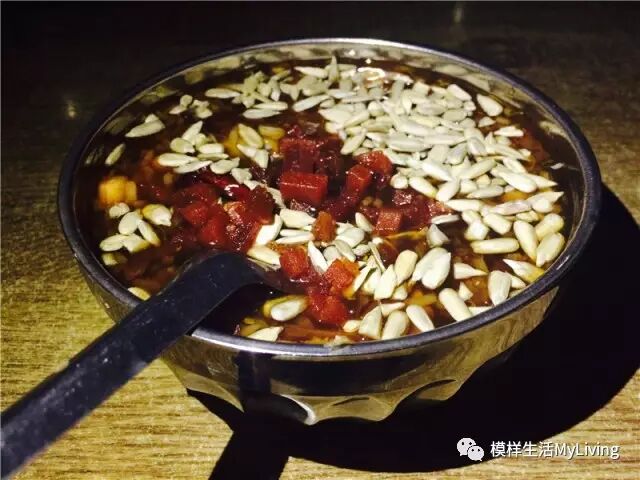 八宝稀饭是一种甜粥,又称八宝甜饭,八宝饭,是陕西省特色传统美食之一。网上的方子各不一样,而我们吃到的八宝稀饭里面有瓜子、百合、糯米、花生、山楂、红枣、莲子和提子干8种材料。甜甜的稀饭里带有浓郁的桂花香味,还有一点点酒糟的香味,材料并非入口即化,而是带有一点嚼头,非常不错。