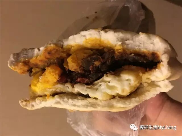 同样是回民街的夹膜,比起杨天玉家的腊牛肉夹膜,小样儿会更推荐老金家的蛋菜夹膜。蛋菜夹膜是素的膜,所以价格也会低一点。它的味道咸香浓郁,里面加了咸菜、蛋黄、煎蛋和酥脆的炒花生,还有秘制的辣酱涂抹在馍上,使得它的口感特别丰富。