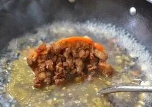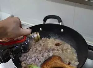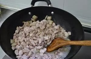 煸炒到肥肉吐油倒入瘦肉翻炒,到水分大部分丧失。