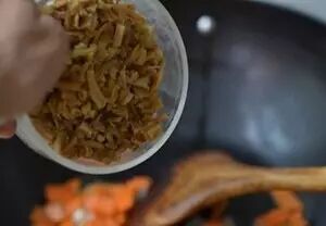 热锅凉油下入姜末和五香粉一小勺炒香。呛入适量“岐山香醋”根据之前肉臊子的醋量和自己口味加,但是正宗臊子面一定要酸字出头。加入适量盐和素臊子。加入炒好的肉臊子烧开。