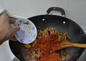 中小火焖烧到水分基本丧失5-10分钟吧,撒入大量辣椒面(我用大概两大勺)。关火炒均匀。