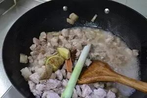 加入酱油、盐,加入醋大量大概一小碗二斤肉大概二两醋,总之量要大些,但是这也根据个人口味和后期汤的制作,因为做汤还要放醋。