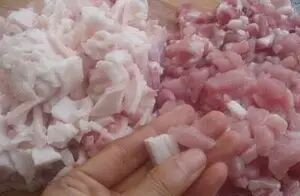 买来的五花肉(二斤)肥瘦分开切成指甲盖大小的薄片,瘦的肉可以切丁丁。