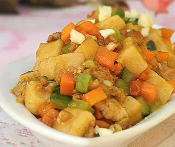 7、放入土豆胡萝卜丁翻炒片刻,放入盐、黑胡椒粉适量调味即可关火。