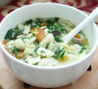 原料:面粉、鸡蛋、香菇、胡萝卜、菠菜、盐、香油