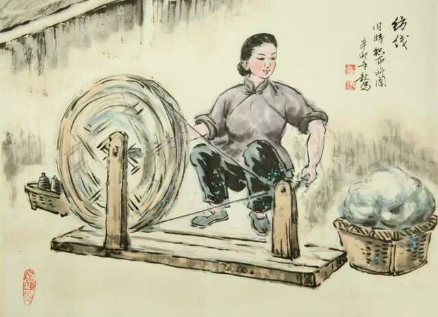 纺线是中国传统耕织社会的主要生产项目。纺线时先是将棉花拿到弹匠那里将棉花弹成蓬松如火腿肠粗细长短的棉条。纺车上有一根教梃子的钢丝,尖端朝着纺线人,将棉条旋转并缠在梃子上,准备工作完备后就开始纺线,右手摇车左手握棉条往外均匀的拉,节奏是周而复始。孩提时代那一个个有月明或无月明的夜晚,煤油灯下纺线车那像古老歌谣一样的嗡嗡声,至今仍萦绕在我的的耳边。