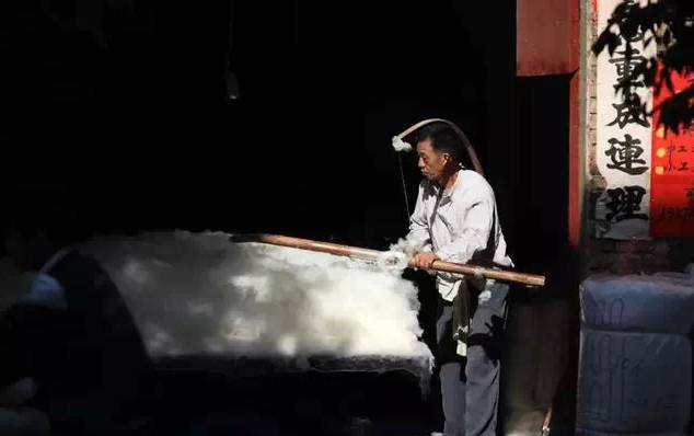 弹棉花,又称“弹棉”、“弹花”,是中国传统手工艺之一,历史悠久,我国至迟在元代即有此业,时至今日仍有操此行业者。曾几何时,随着一声声弦响、一片片花飞,最后把一堆棉花压成一条整整齐齐的被褥,仿佛就是一种魔术,让孩子们惊讶不已。而那时候的弹棉花工匠们也都走街串巷,生意应接不暇。“檀木榔头,杉木梢;金鸡叫,雪花飘”这是弹棉花工匠们对自己的手艺的一种诠释,也是人们对他们的劳动最为形象的比喻。