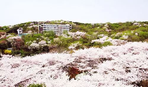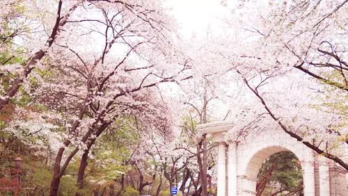 庆熙大学的樱花祭为期一周,大家一般都去本馆(본관)前的广场。恋人坐在喷水池旁的阶梯上,相互依偎密语,一起感受周围樱花的环抱。家庭赏花总忘不了带上几个紫菜包饭,展开野餐垫一家人席地而坐。图书馆前的樱花路最是浪漫,随风飘洒的樱花雨,吸引大家驻足拍照。如果你是一个摄影爱好者,推荐你到本馆附近的教学楼顶拍照。不仅可以拍到整个广场,还能拍到本馆后山上的欧式建筑——和平殿堂(평화의전당)。