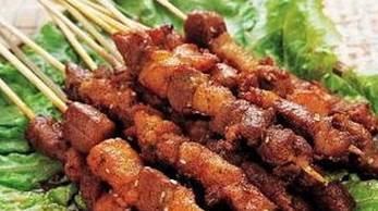 烤羊肉串源于新疆考古家在鲁南临沂市内出土的一座东汉晚期画像残墓中发现刻有烤肉串的画像石,经研究发现这两幅画中所见的人物形象皆为汉人,一男子左手持两串肉的叉,右手拿把扇煽火,在三足鼎上烤肉串。后面悬挂着羊与牛,边上是持有长刀的男子在宰杀牲畜。