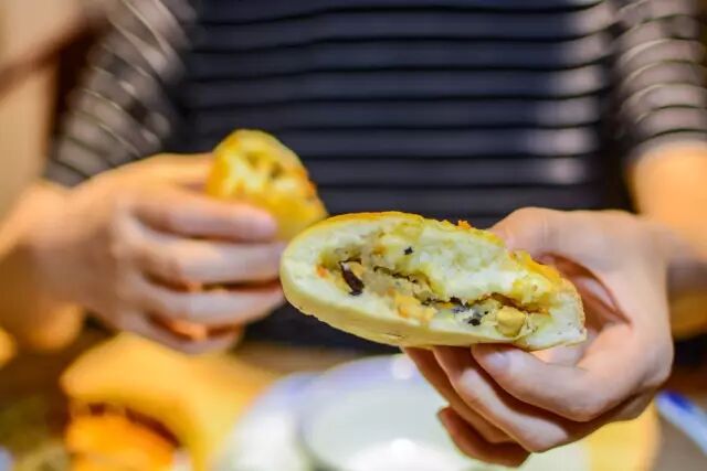掰开包子,里面的馅料竟是豆腐~独特的豆香味和其他配料的融合,特别美味~