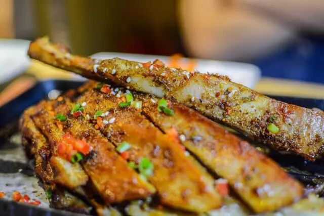 连皮带骨的肋排看着就是一副金黄撩人的样子,羊肉没有多余的油腻,肉质更为紧实而不见膻味。