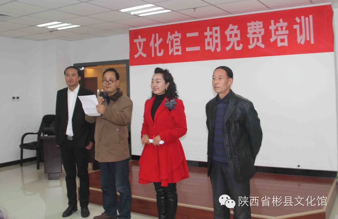 为深入贯彻党的十八届五中全会精神,、财政部关于推进全国美术馆、公共图书馆、文化馆(站)免费开放工作的意见》文件精神,在彬县县委、县政府的高度重视下,,积极践行文化惠民工程、推动全县文化民生工程发展,掀起我县音乐舞蹈艺术事业的发展高潮,丰富广大人民群众的精神文化生活,彬县文化馆于2015年11月9日上午10:00举办了二胡演奏免费培训班开班仪式,本次培训由我馆职工王胜利、王博担任授课老师,进行为期一周的培训,培训学员为我县文艺界爱好者及乡镇文化专干,参加本次培训的所有学员文化馆免费发放二胡一把,由文化馆馆长王晓荣同志在开班仪式上统一发放。