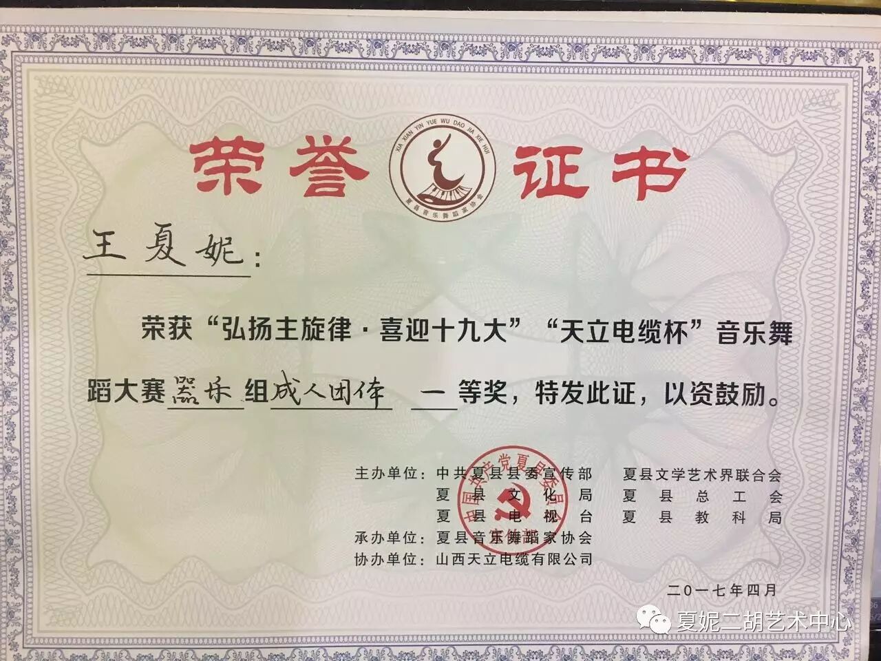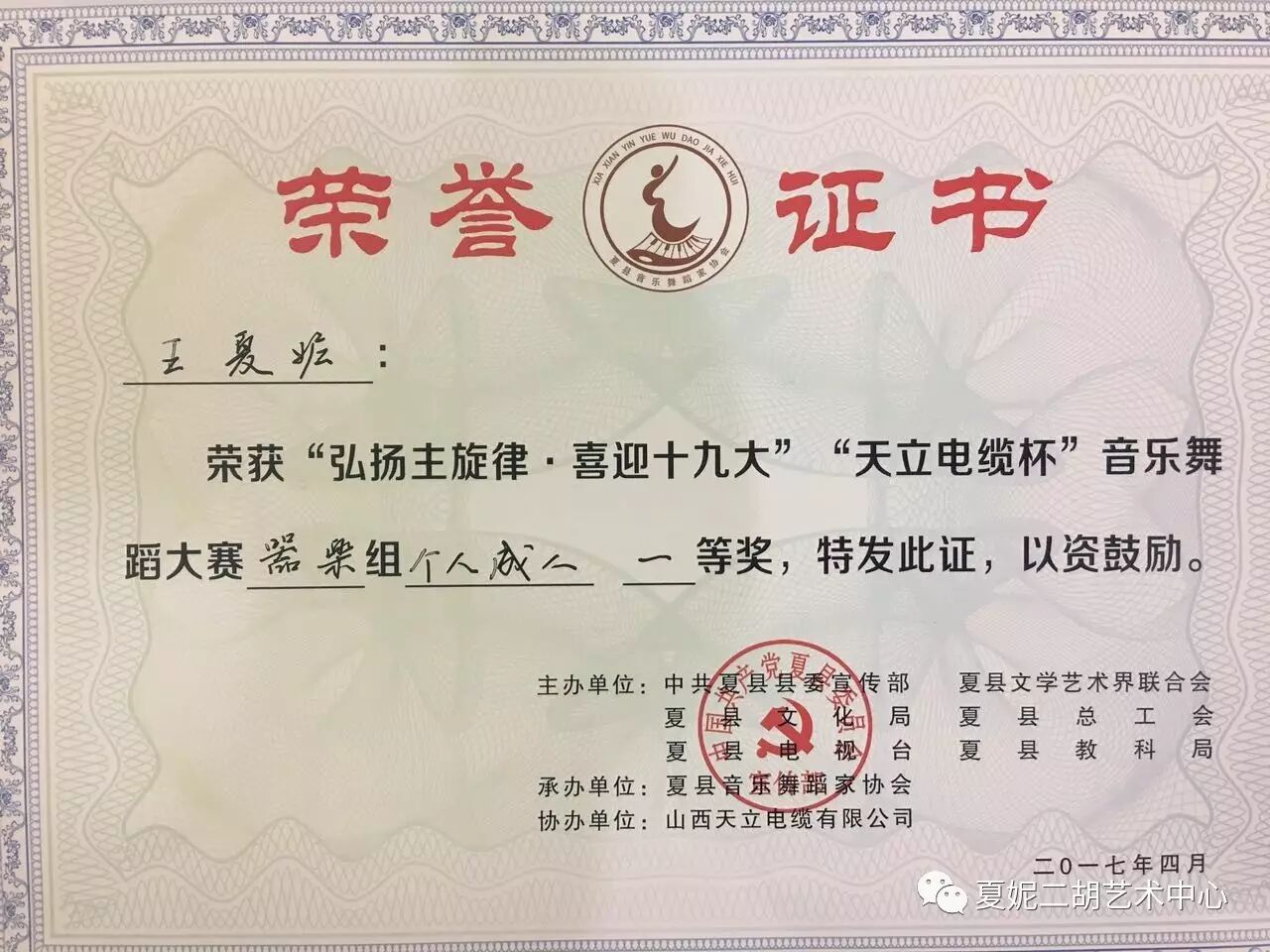 2017年荣获“弘扬主旋律,喜迎十九大”“天立电缆杯”音乐舞蹈大赛器乐组个人成人一等奖和成人团体一等奖
