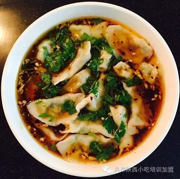 酸汤水饺是一种陕西地区古老的汉族传统小吃,具有1000多年的历史。酸汤水饺是把羊肉水饺放在特制的酸汤内食用。